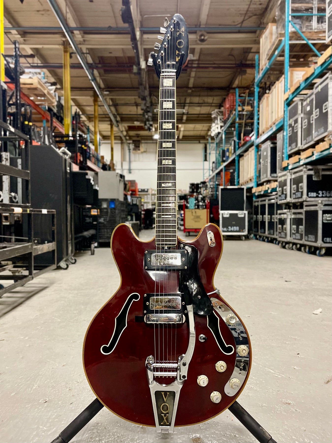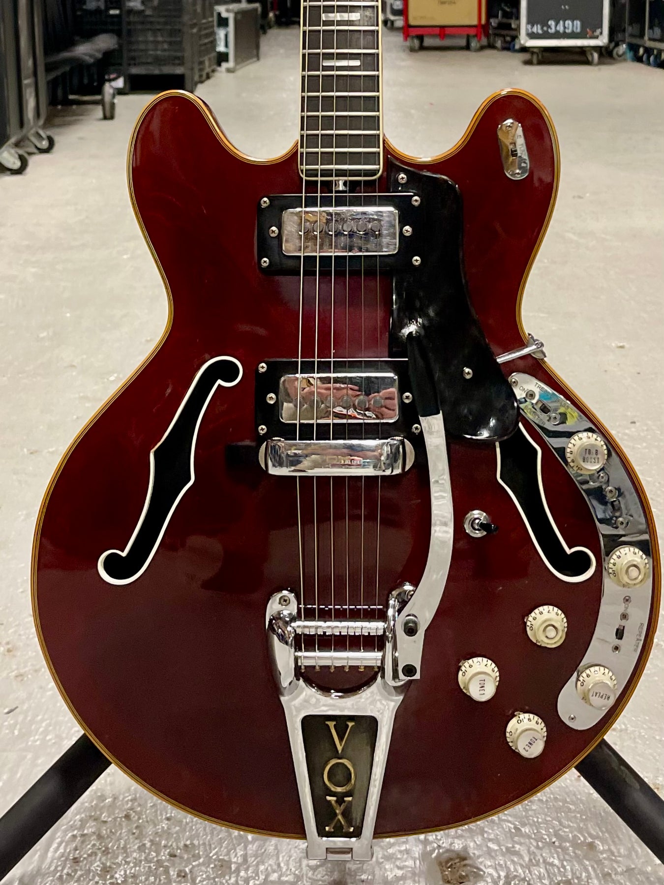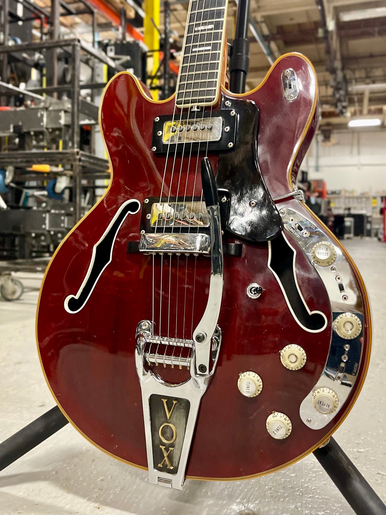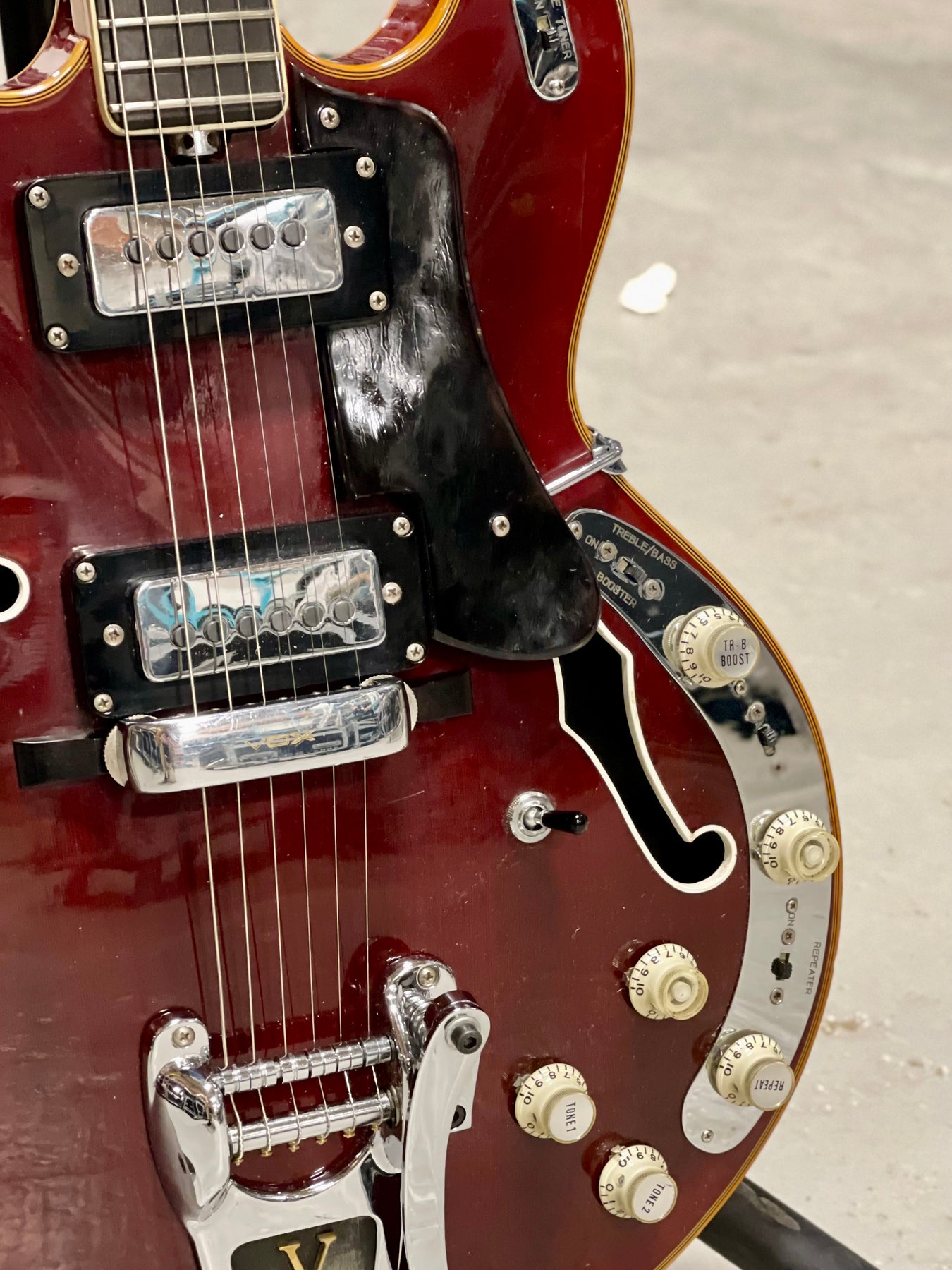 The Vox V267 Cheetah guitar hoped to lure a customer away from a ES-335 by offering Gibson styling but adding battery operated internal effects. An E-tuner, treble and bass booster, distortion booster and repeat percussion were incorporated into the guitar. The Vox Cheetah guitar was offered in the 1967 "Vox, It's Whats Happening" and the 1968 "The Sound That Travels With the Stars" catalogs.