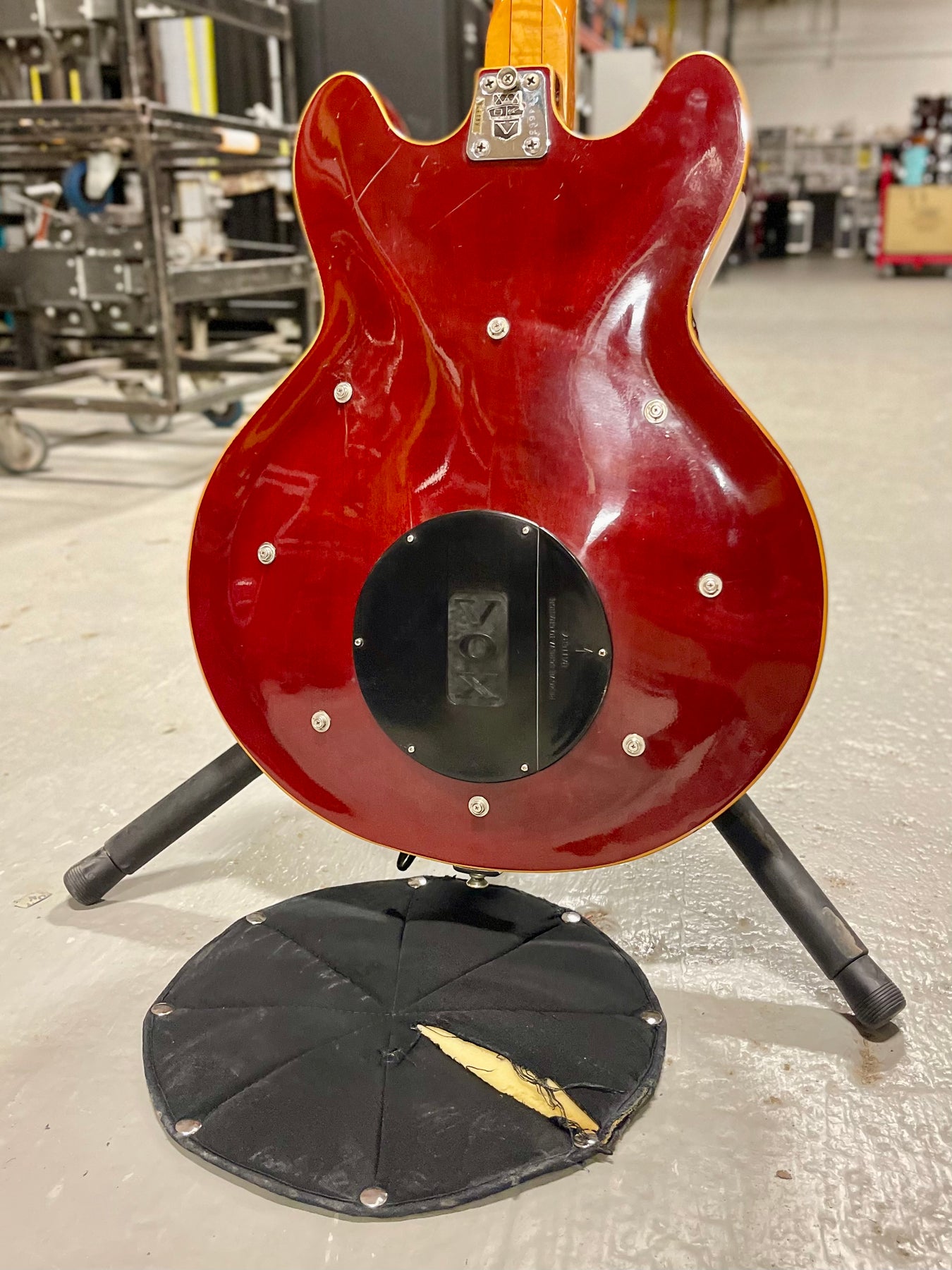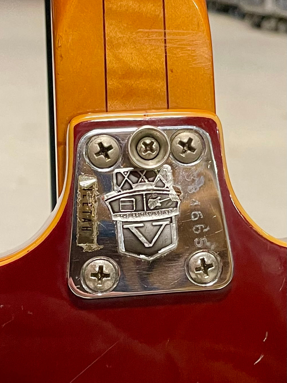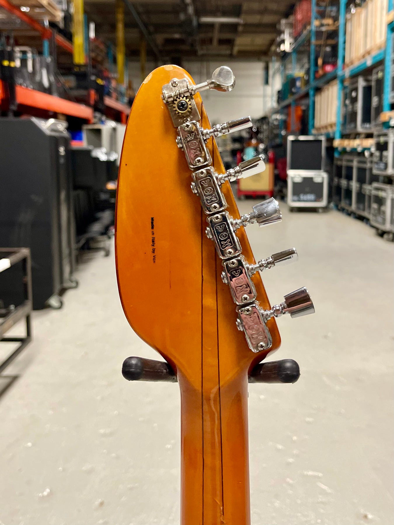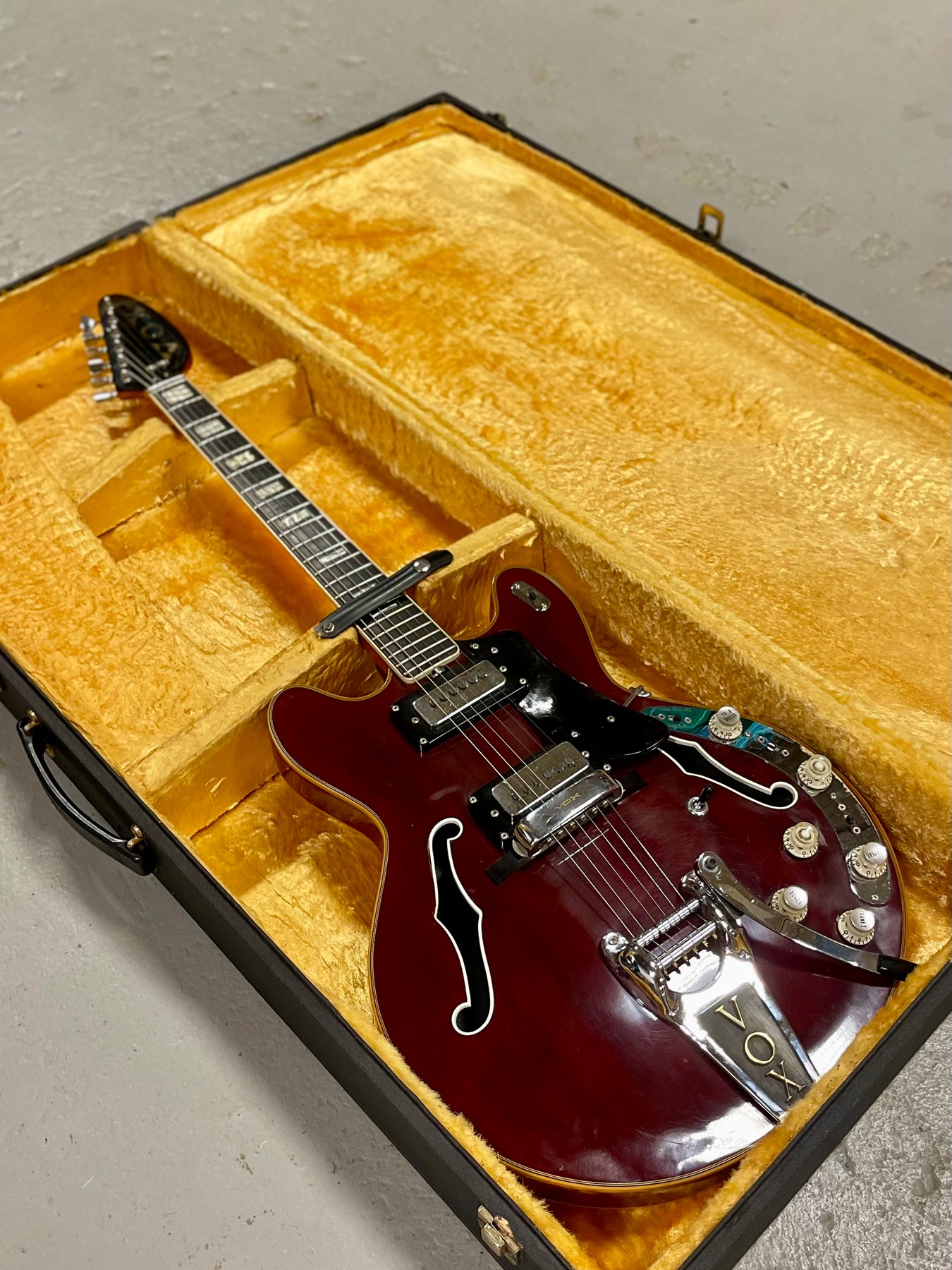 The high E string tuner has been replaced, and like many Vox '60s models, the pickguard has warped. You’ll notice gentle wear on the neck’s back from years of playing, and the cherry finish shows charming pick marks. Approaching 60 years old, these little signs of wear tell a story full of character.