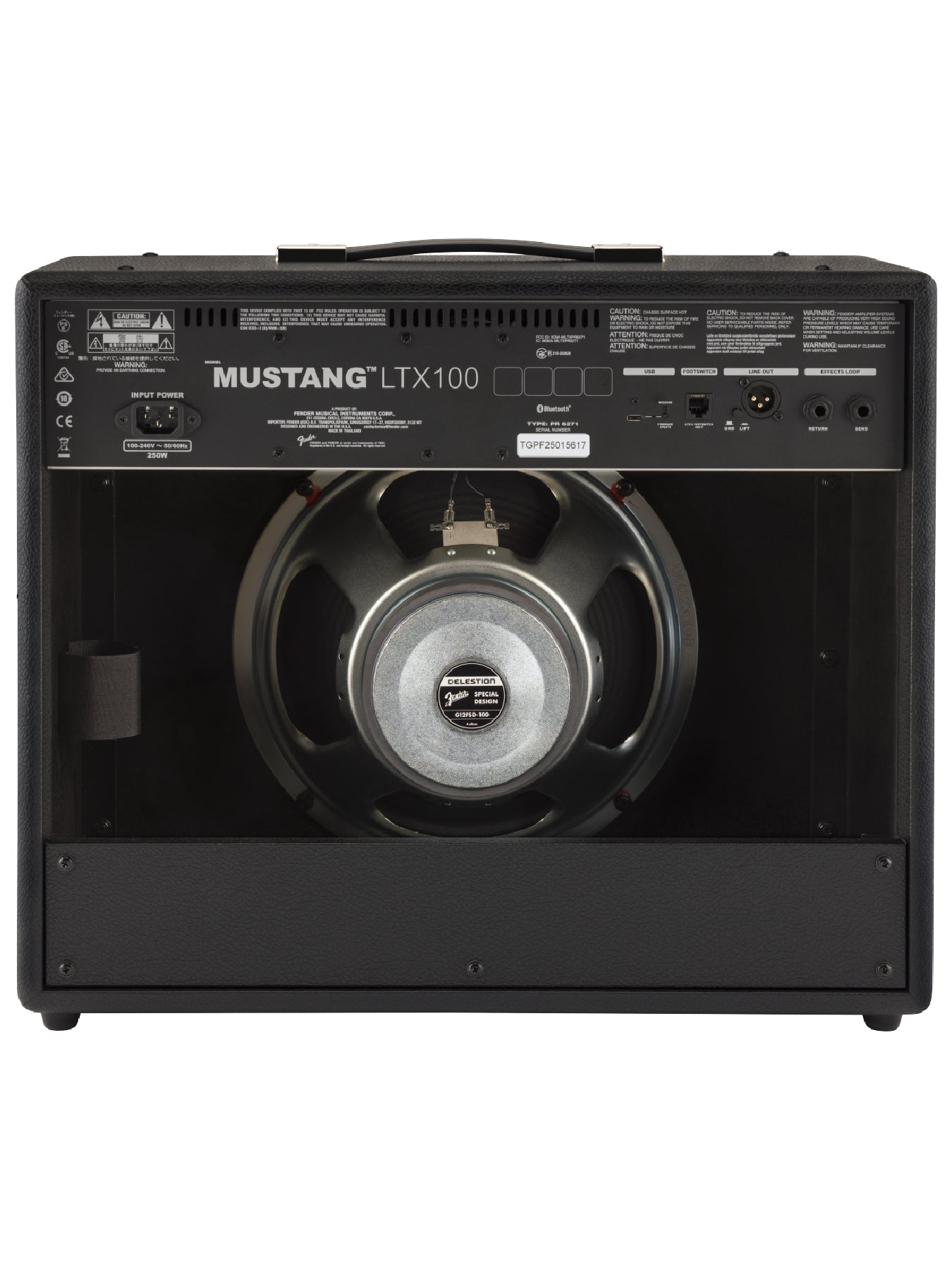 Available in both 50 and 100-watt models, Mustang LTX is ideal for practice or performance with a 12" Celestion G12FSD-100 speaker and an optional gig-ready 5-button footswitch. Onboard Bluetooth allows you to jam along with your favorite songs as well as create, edit, download and share presets using the Fender TONE app.