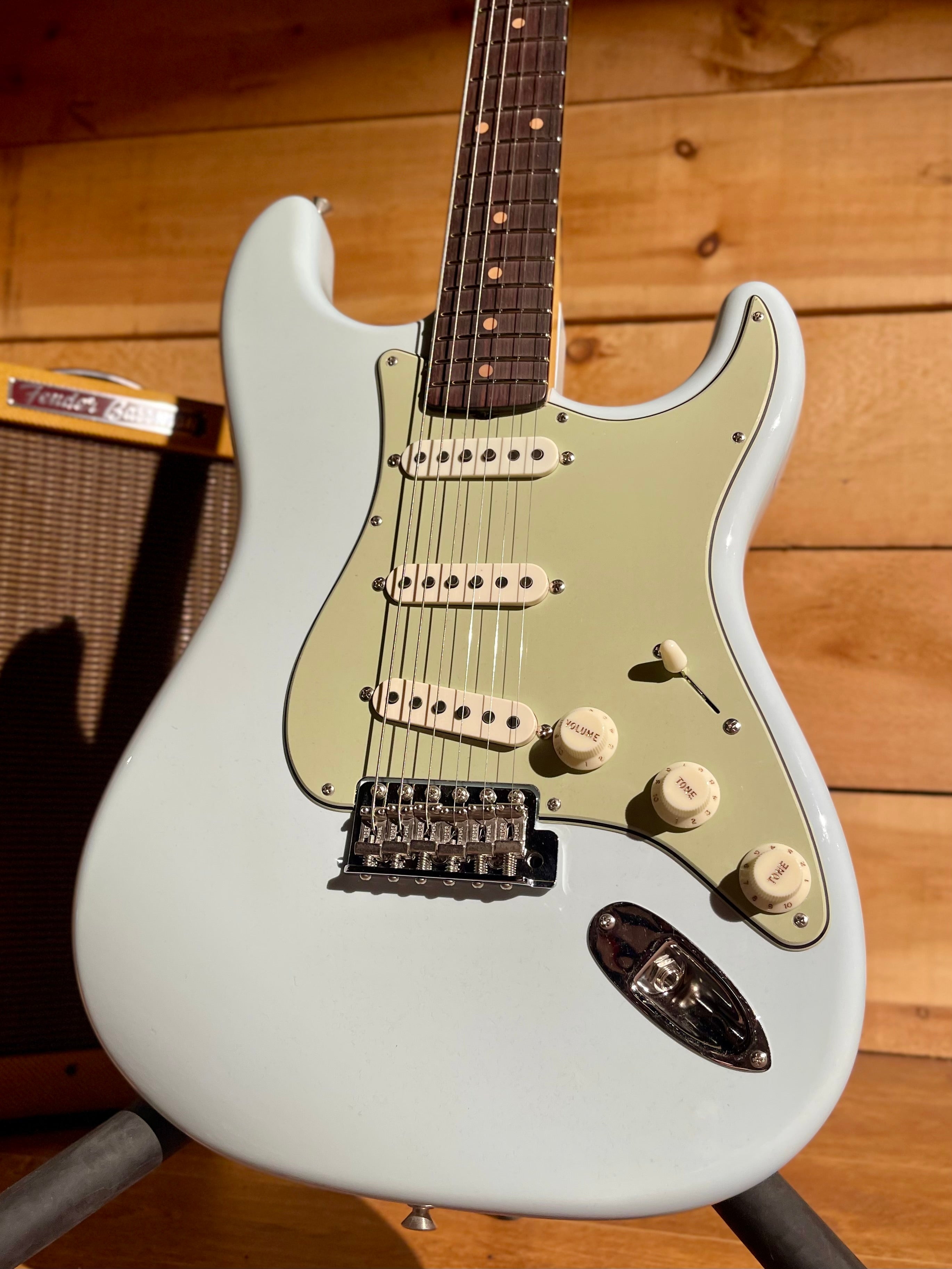 Other features found on this guitar include a 2-piece select alder body, tinted rift-sawn maple neck with '59 "C"-shaped neck profile, 21 medium vintage frets, Custom Shop hand-wound '59 Strat single-coil pickups, 5-way switch, vintage wiring, 3-ply mint green nitrocellulose pickguard, American Vintage synchronized tremolo bridge, bone nut, wing string tree and vintage-style tuning machines.
