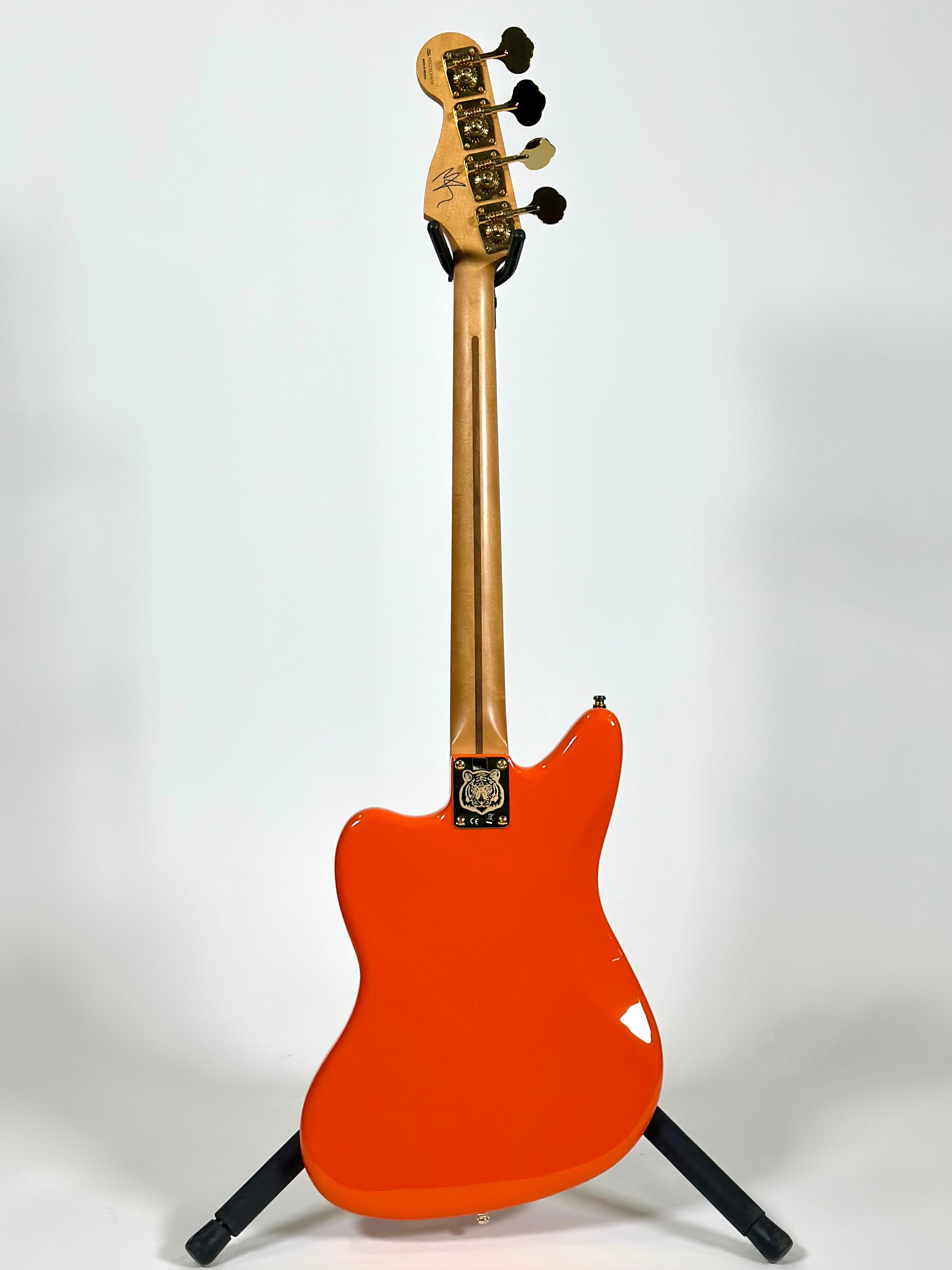 The Mike Kerr Jaguar® Bass delivers the ferocious tones that ignite the iconic riffs of chart-topping British rock duo Royal Blood. Featuring an alder body and a maple neck with slab rosewood fingerboard, this classic Fender tonewood formula delivers well-defined punch, massive resonance and ample warmth. Effortlessly playable, the compact 30" scale length Modern "C"-shaped neck sports a slim profile and medium jumbo frets on a 9.5" radius fingerboard for a modern playing feel. Outfitted with a versatile set of high-output humbuckers, the Mike Kerr Jaguar® Bass is uniquely suited to replicate Mike's aggressive, anthemic riffs and searing lead lines. Gleaming gold hardware and elegant block inlays complement the vibrant Tiger's Blood Orange finish to create a truly striking aesthetic.