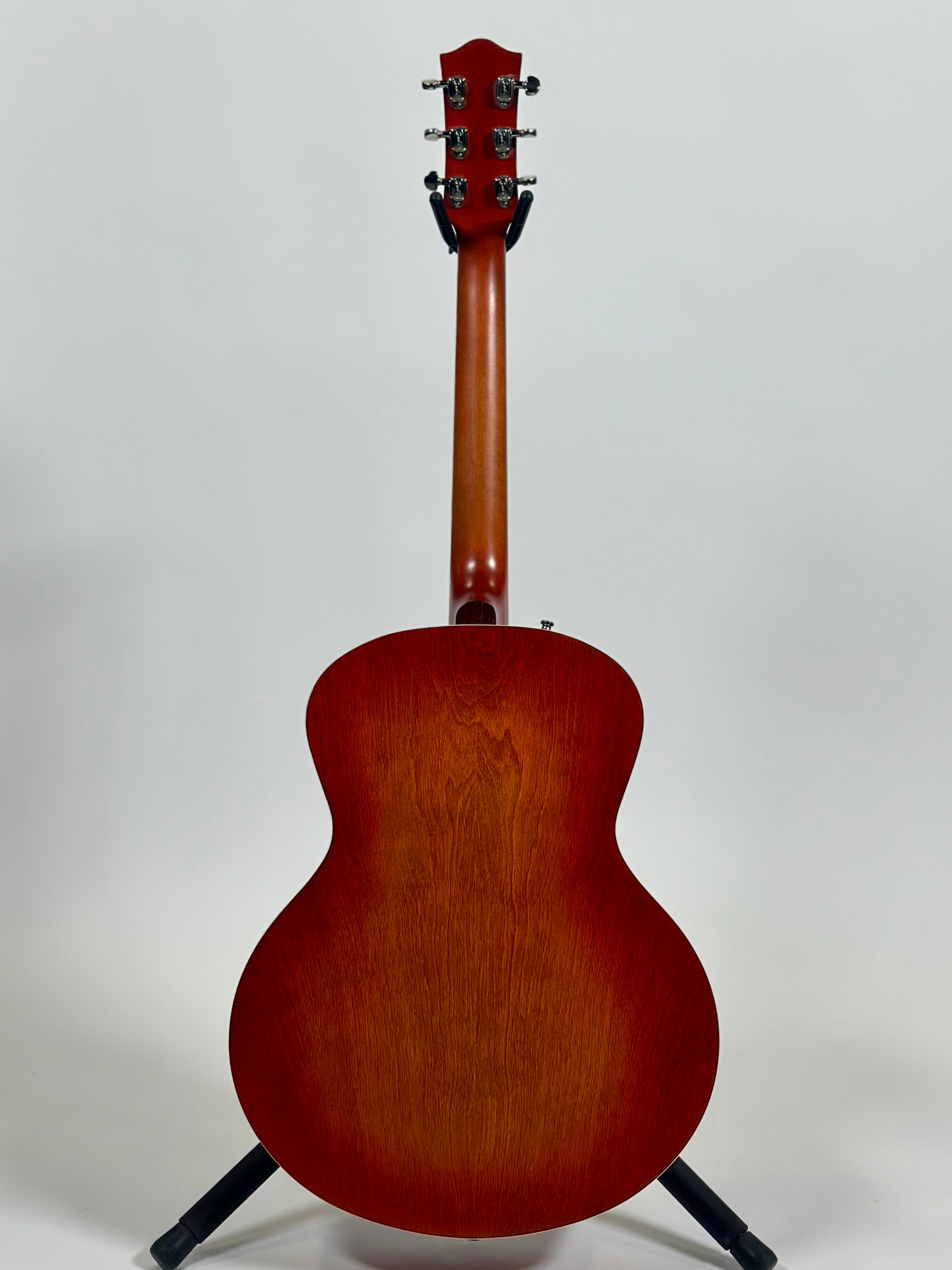 The Jumbo body provides plenty of projection, with its Canadian Wild Cherry archtop top, back and sides and retro-inspired custom polished finish. Other features include a Rosewood fingerboard, Silver Leaf Maple Neck, Graphtech Adjustable Tusq Bridge (base) w/ T.O.M. With Roller Saddles and trapeze tailpiece and a custom-engraved headstock plate. The 24.84” scale neck offers an exceptionally comfortable feel to this guitar – delivering rich sound and great looks.