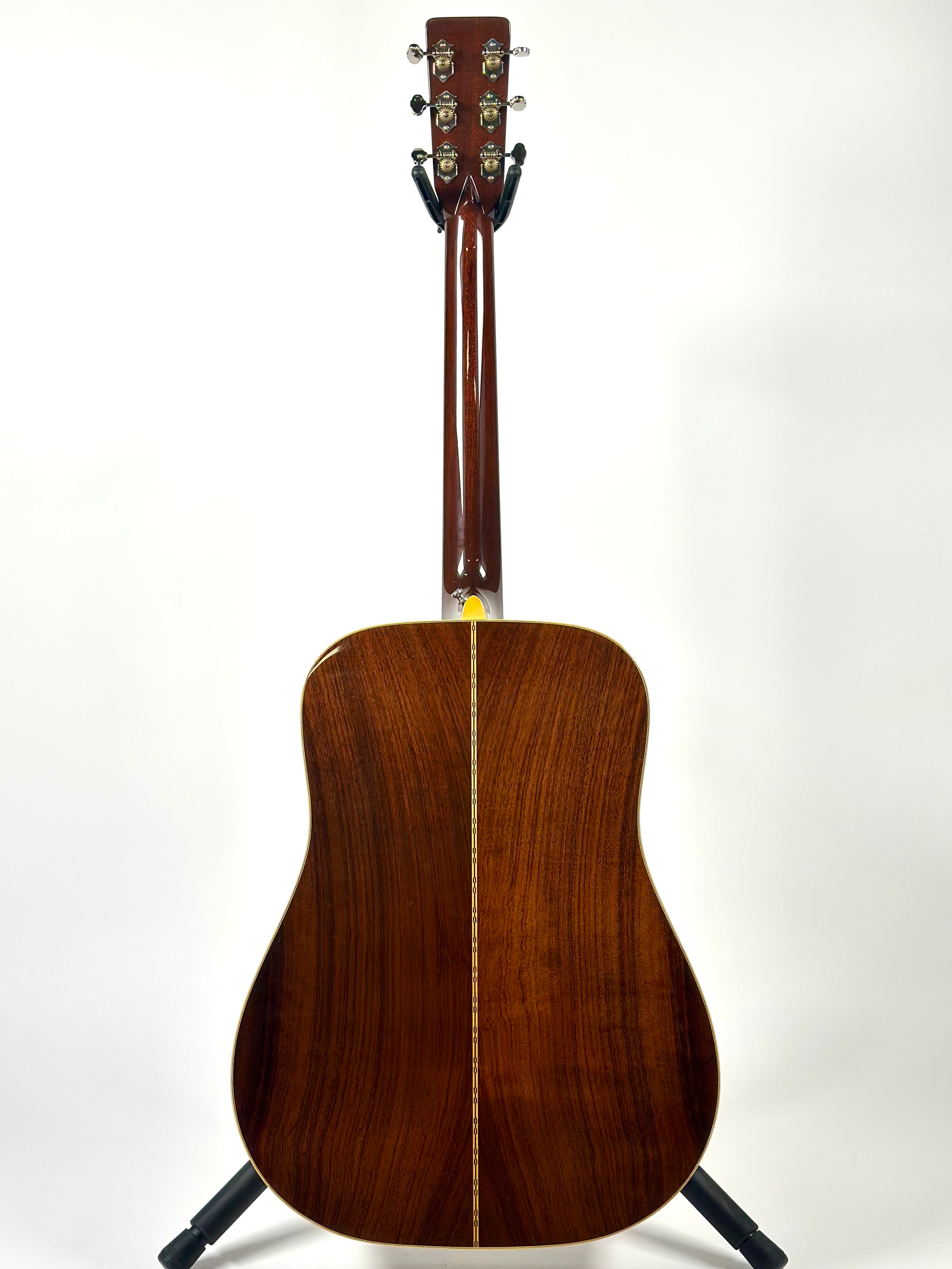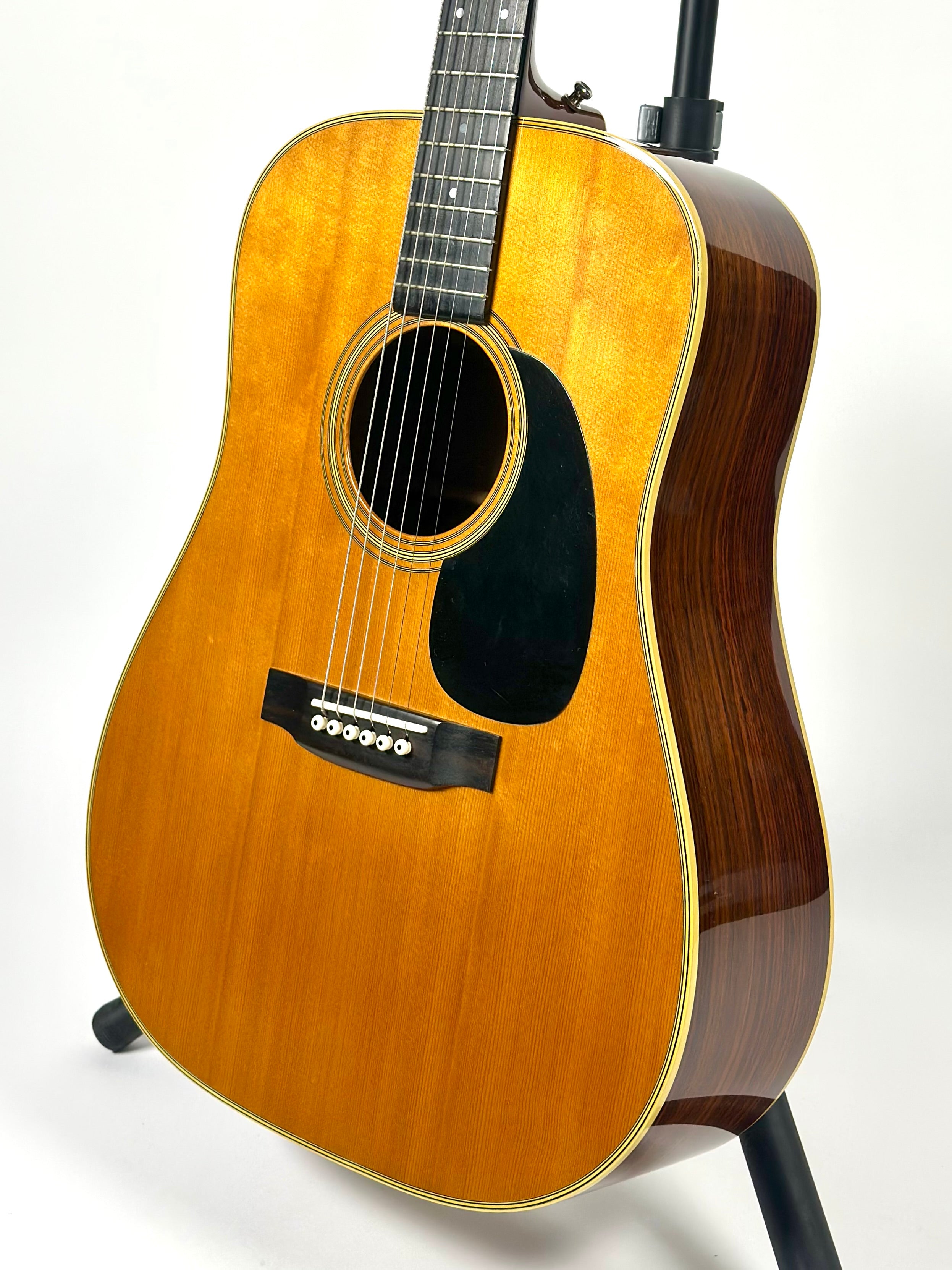 The Martin D-28 has developed a rich history over the years, and is seen by many as a true workhorse acoustic flat top and arguably Martin's flagship Spruce & Rosewood guitar, having been used by countless musicians across folk and rock music since the companies establishment in 1833. This 1983 Martin D-28 150th Anniversary celebrates this milestone, with these instruments often considered some of the best modern made Martin guitars of the last 40 years. Featuring a Sitka Spruce top with East Indian Rosewood back & sides, the top is braced with scalloped forward shifted X bracing, making it extremely resonant with a real dynamic range. The neck features a low oval profile that is modern and comfortable to play while retaining a slightly chunkier vintage feel. Other features include an ebony finger board and bridge along with a black plastic pickguard, herringbone binding and zigzag back strip. Inside the sound hole is stamped with '1833-1983,' marking this as an Anniversary model.